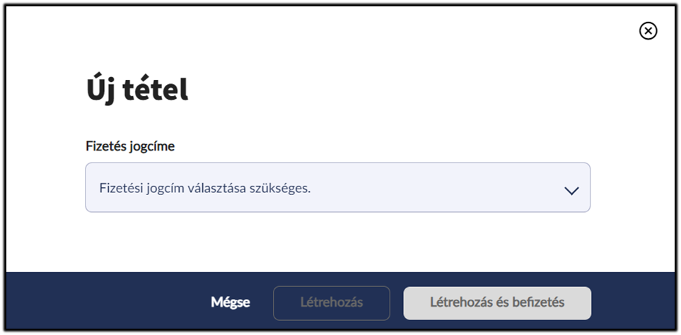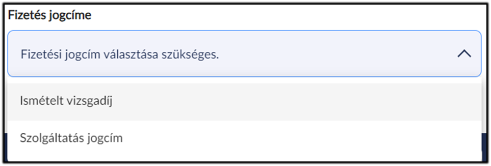 Az Áttekintés és a Befizetendő menüpontokon az Új tétel gombra kattintás után elsőként a fizetés jogcímét szükséges megadni, amely vagy Szolgáltatás jogcím vagy pedig Ismételt vizsgadíj. A Vizsgajelentkezés menüpontról csak Ismételt vizsgadíj kiírása indítható.