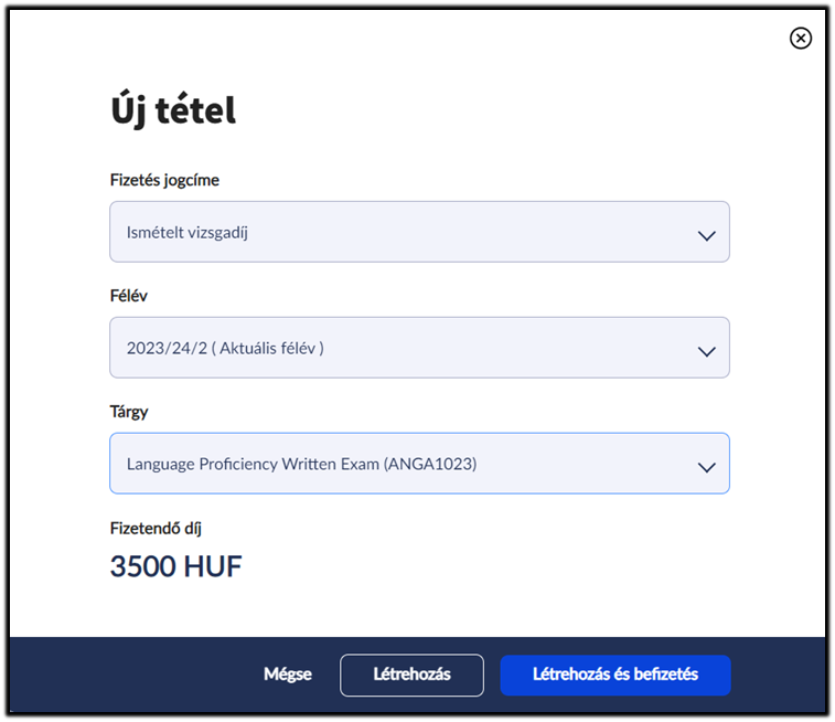 Amennyiben a hallgató mindent megfelelően beállított, két lehetősége van a művelet befejezésére. A Létrehozás gombra kattintva az adott tétel létrehozásra kerül és megtalálható lesz a Befizetendő menüponton, de a tétel még nem kerül teljesítésre. A Létrehozás és befizetés gombra kattintva a program felkínálja a befizetési módok ablakot, és kiírást a hallgató azonnal be is fizetheti, amelyet ezután a Befizetett tételek menüponton tekinthet meg.