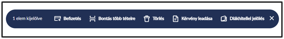 A tanulmányi rendszerben a hallgatók csak a saját maguk által kiírt és még teljesítetlen tételeiket tudják törölni, amennyiben még nem került számla kiállításra. Vagyis az intézmény adminisztrátorai, vagy oktatói által kiírt, ill. a rendszer által generált tételeket nem. Ennek megfelelően, ha mégis más által kiírt tételt próbálna törölni, akkor a program megakadályozza a műveletet és visszajelző üzenetben értesít róla, hogy csak saját tétel törölhető. Törléshez a törlésre szánt tételeket kijelölve az oldal alján megjelenő menüsorban található Törlés gombra kell kattintani.